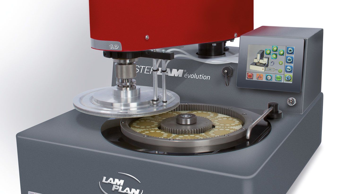 The MASTERLAM® Evolution is based on a simple kinematic proposing 2 movements: clock-wise or anti-clockwise rotation of the superior plate and the main cogwheel with speed programming. These 2 movements will allow you to respond to most of your needs in terms of polishing of small series of all types of materials.