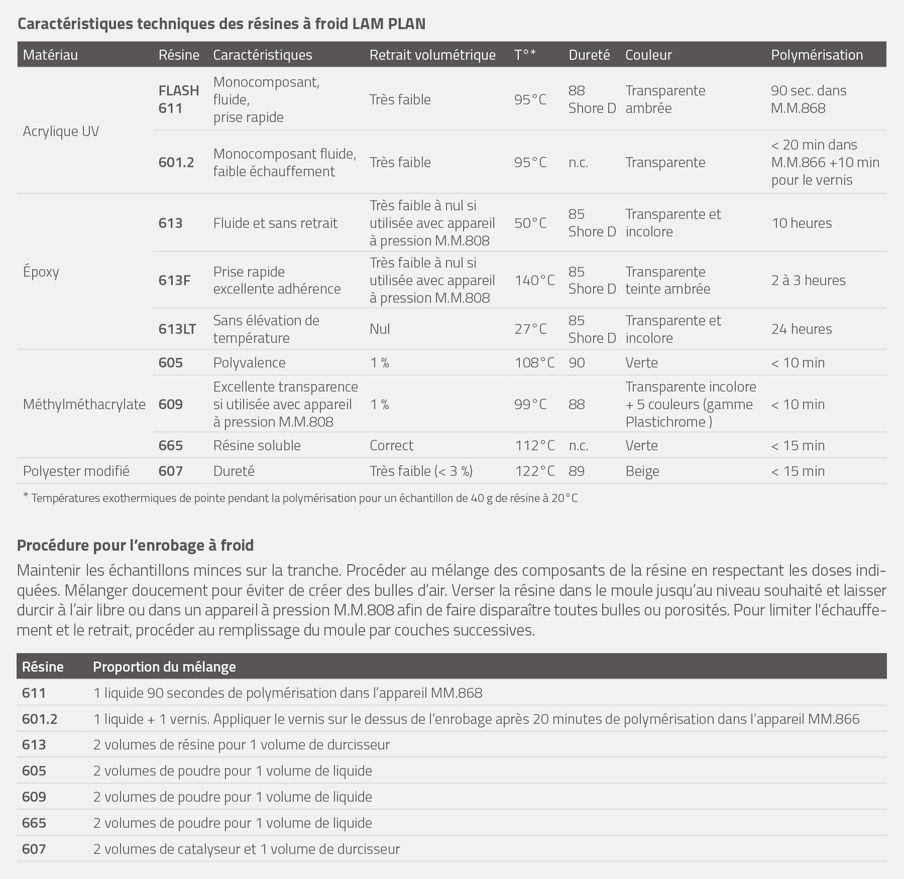 La résine 613LT est une résine époxydique durcissant sans élévation de température. Elle est préconisée dans les cas où les échantillons seraient dégradés par un échauffement pendant la polymérisation.